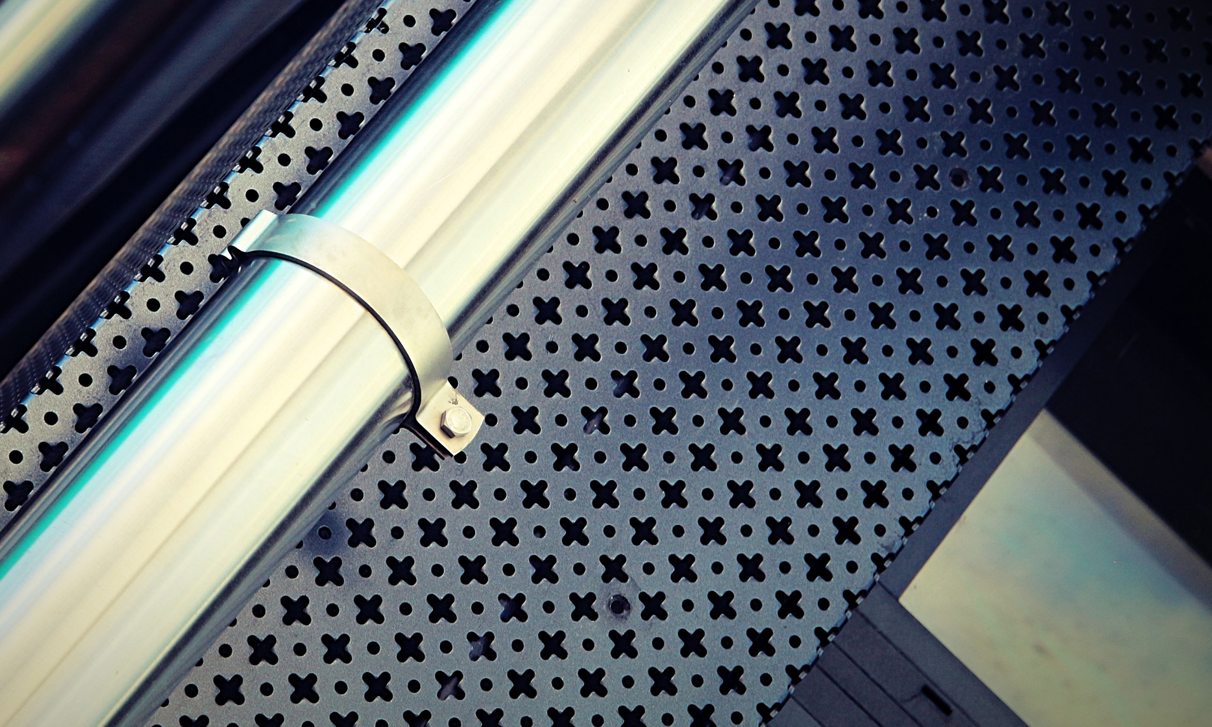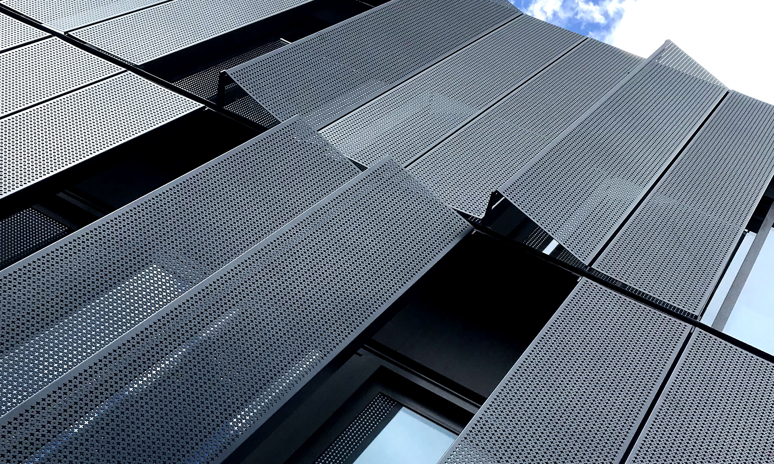 These striking building panels located on Shotover Street in Queenstown, were made from 3.0mm Aluminium 5251 and powder coated in standard Dulux colours. The screens feature our Clover Leaf perforation, which is a 5.0 x 17.5 x 17.5mm pattern with Ø 6.0mm holes, 25.0mm square centers and a 27% open area. Designed to keep direct sunlight out of the offices while still providing an adequate amount of light to pass into the building, this pattern also makes for a stunning contemporary look.