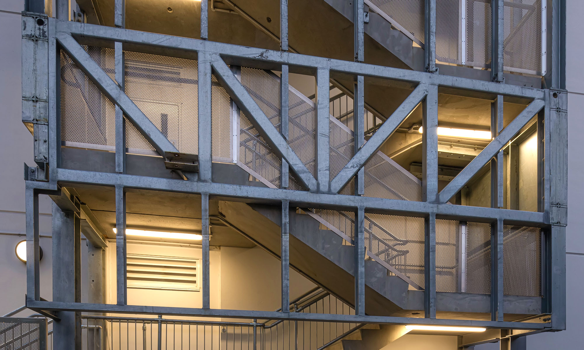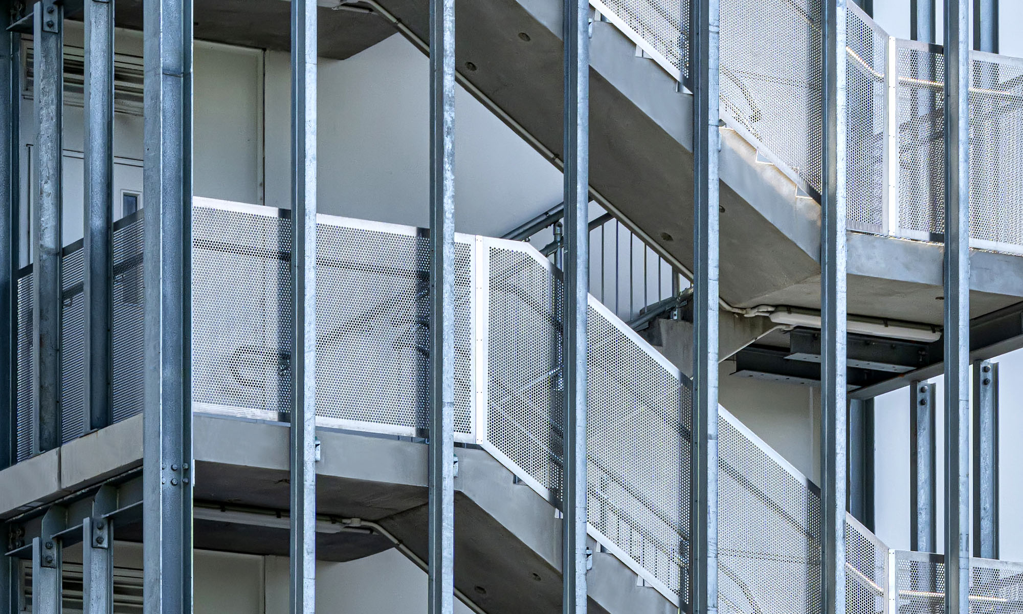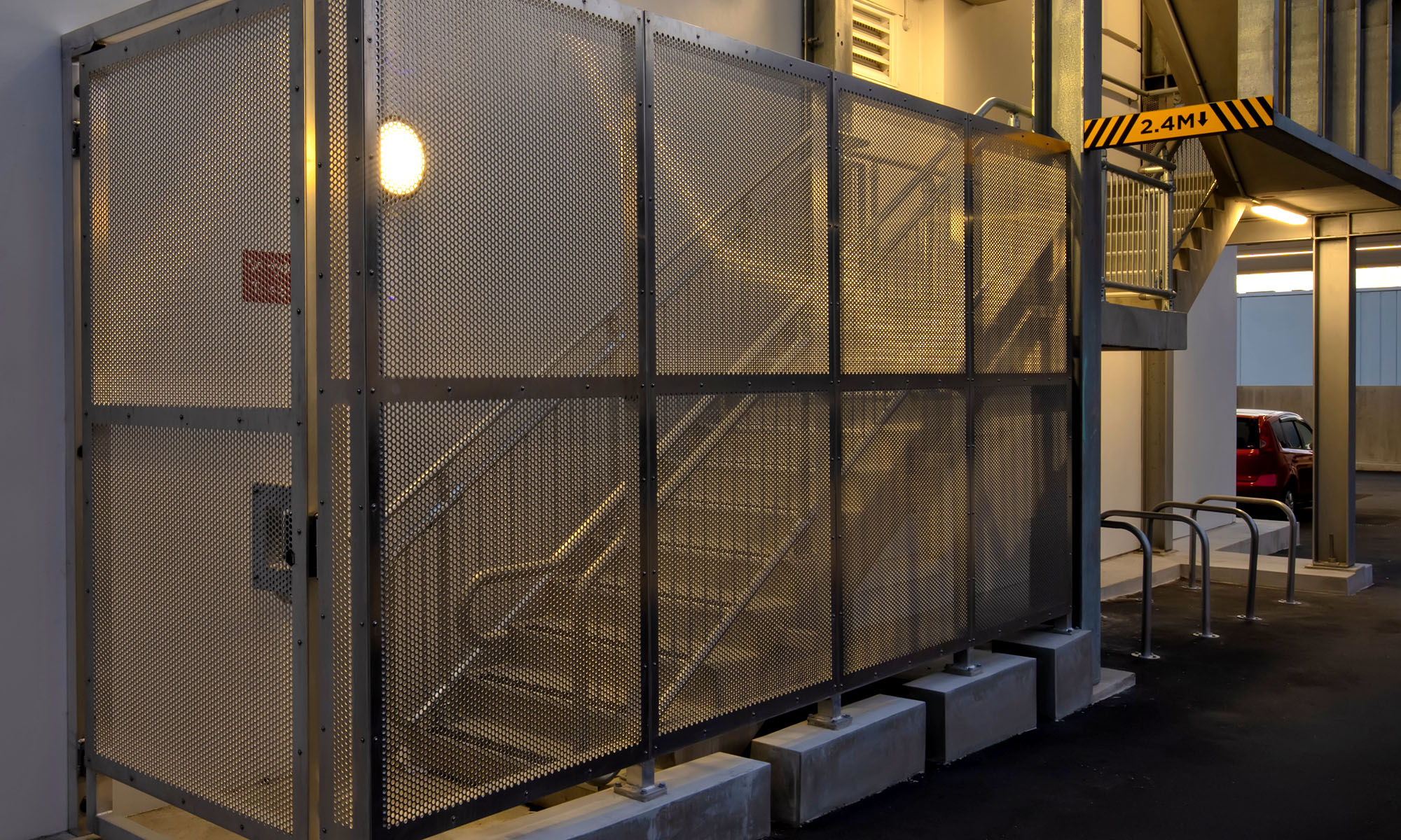 Auckland’s Sudima hotel makes use of our popular and versatile PMR291 perforated pattern to provide security and safety for an external set of stairs. These 3.0mm Aluminium panels were custom-manufactured in a variety of different sizes and angles required for the project, and the pattern chosen ensures adquate lighting for the area due to its Ø12.7mm holes and 49% open area.